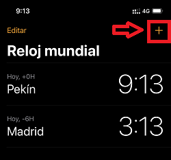 Paso 3. Dentro de la app, presiona el símbolo "+" para añadir un nuevo reloj.