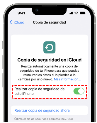 - iCloud: Ve a Ajustes > [tu nombre] > iCloud > Copia de seguridad y toca en "Realizar copia de seguridad ahora". Esto requiere que el dispositivo esté conectado a Wi-Fi y tenga suficiente batería.