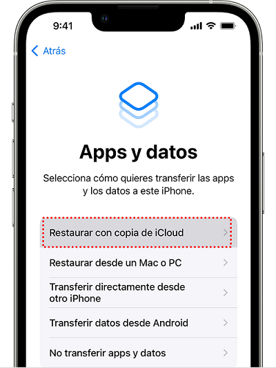 Paso 6. Cuando se te solicite, elige la opción "Restaurar con copia de iCloud" y selecciona la copia más reciente.