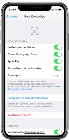 Para que Face ID funcione correctamente, la cámara TrueDepth debe tener una visión clara de tus ojos, nariz y boca. Cubrir parcialmente el rostro, por ejemplo con una mascarilla, impedirá el reconocimiento facial y el sistema solicitará automáticamente tu contraseña al desbloquear el dispositivo.
