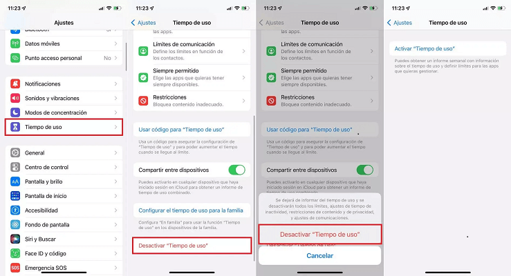 Una de las razones más comunes por las que aparece el aviso “no se puede cerrar sesión debido a restricciones” es porque el Tiempo de uso en pantalla está activado. Al deshabilitar esta función, se eliminan las limitaciones de cambios en cuentas y contraseñas.