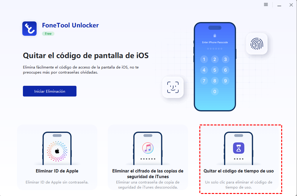 Además de desactivar el bloqueo por Tiempo de uso, FoneTool Unlocker ofrece funciones avanzadas como la eliminación de contraseñas de pantalla (código numérico, Face ID o Touch ID), desbloqueo de Apple ID sin credenciales, eliminación de copias de seguridad cifradas en iTunes y más. Es una solución integral para diferentes situaciones de bloqueo en iPhone o iPad.