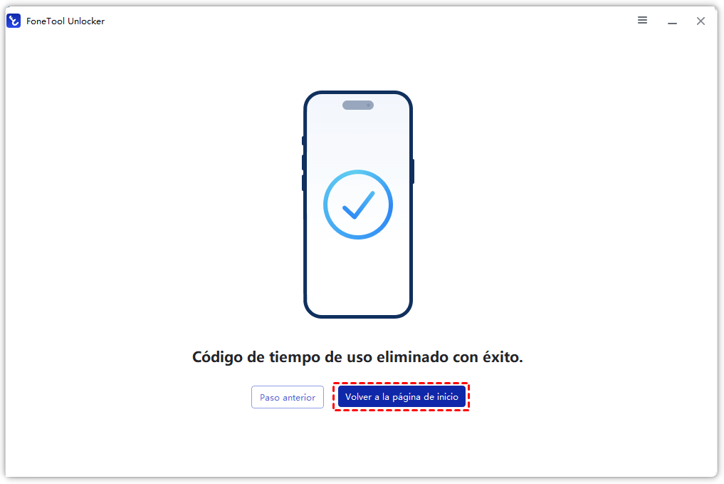 Paso 3. A continuación, FoneTool Unlocker comenzará a eliminar el código de tiempo de pantalla y a desactivar el tiempo de pantalla. Después de que el proceso termine, ve a tu iPhone y sigue las instrucciones en pantalla para configurar el iPhone. Puedes encontrar el Tiempo de Pantalla desactivado en los Ajustes con éxito.