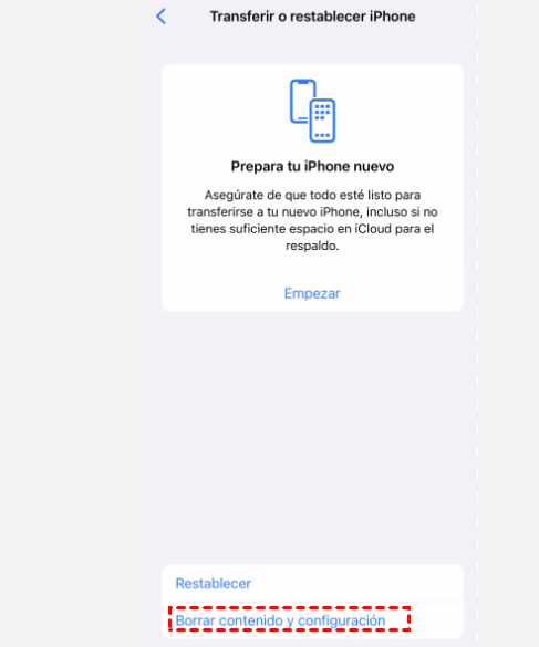 Pulse iPhone "Ajustes" - "General" - "Transferir o restablecer iPhone" - "Borrar contenidos y configuración", tenga en cuenta que es la opción de pulsar "Borrar contenidos y configuración", no "Restablecer".