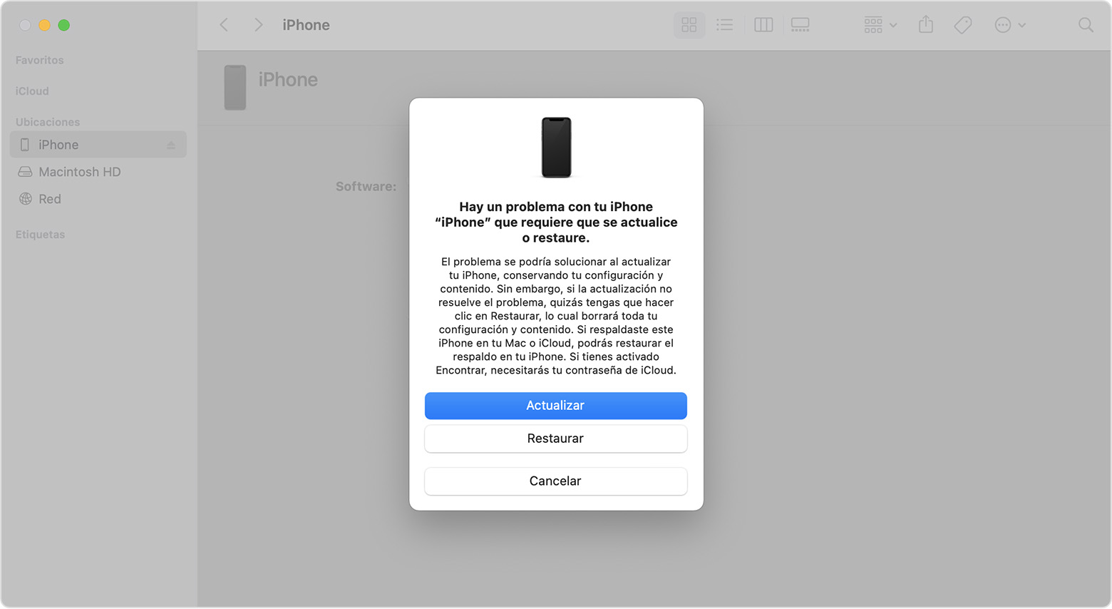 1. Conecta el iPhone al ordenador. iTunes o Finder mostrarán una ventana emergente con opciones para Actualizar o Restaurar.