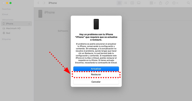Paso 3. En la ventana emergente de iTunes, selecciona la opción "Restaurar" para restaurar iPhone de fábrica bloqueado. iTunes descargará el firmware y comenzará a restaurar tu dispositivo a su configuración de fábrica.