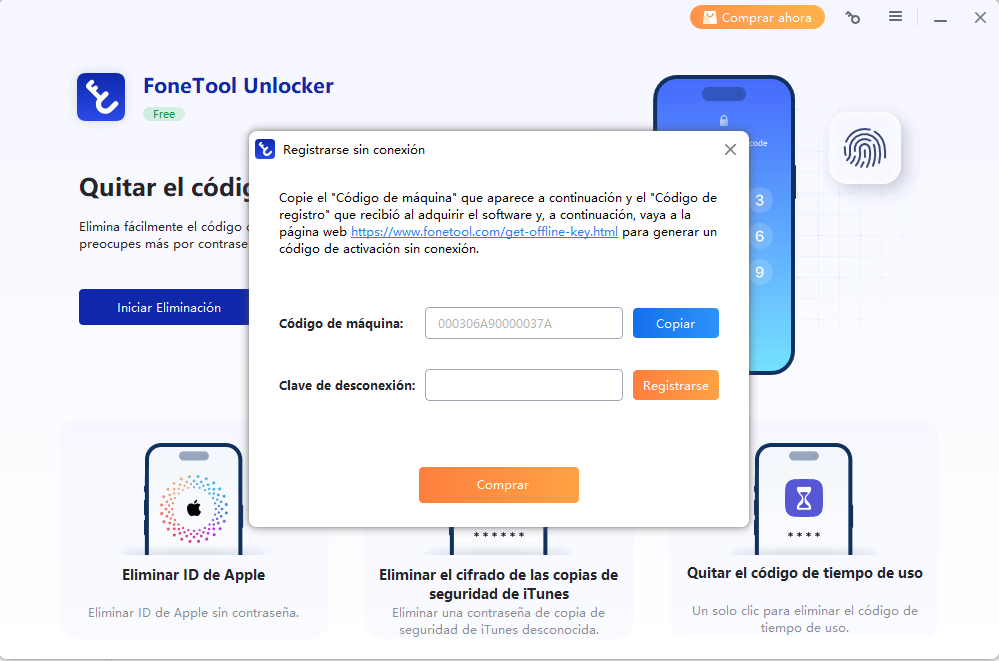 Paso1. Inicie FoneTool Unlocker sin conexión a internet para que aparezca una ventana de registro offline. Y luego, conéctese a internet y abra la URL (https://www.fonetool.com/get-offline-key.html) en la ventana de registro offline de la siguiente manera. O, puede abrir la URL en otro computador con conexión a internet.