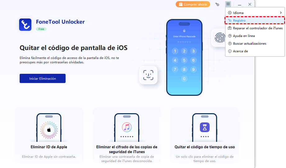 Paso 1. Inicie FoneTool Unlocker. Ejecute FoneTool Unlocker, habrá una ventana emergente de registro. Si usted no ve la ventana emergente o cerrarlo por accidente, también puede hacer clic en el «Menú» - «Registro» botón o haga clic en el icono de la llave en la esquina superior derecha.