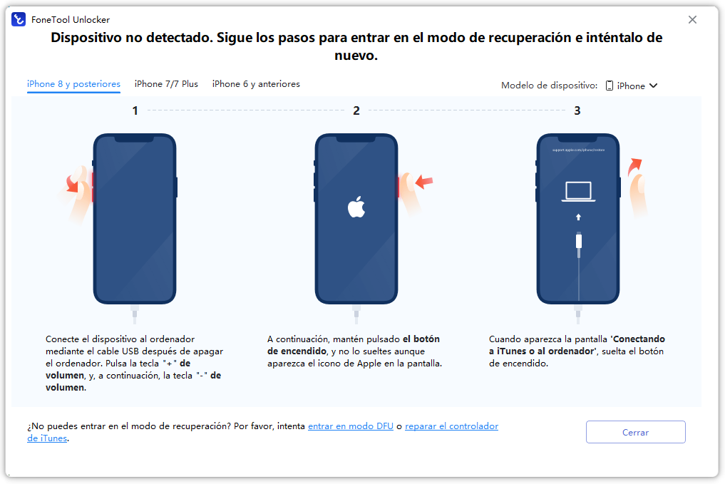 Si tu iPhone, iPad o iPod Touch no es reconocido por tu ordenador o por FoneTool Unlocker, incluso después de múltiples intentos de conexión, esta guía te ayudará a entender las posibles causas y te proporcionará los pasos para resolver el problema.