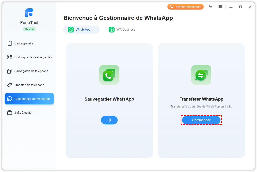 Étape 2. Lancez FoneTool, cliquez sur Gestionnaire de WhatApp dans le volet gauche de l'interface principale > cliquez sur WhatsApp > sélectionnez Transférer WhatsApp > touchez Commencer.