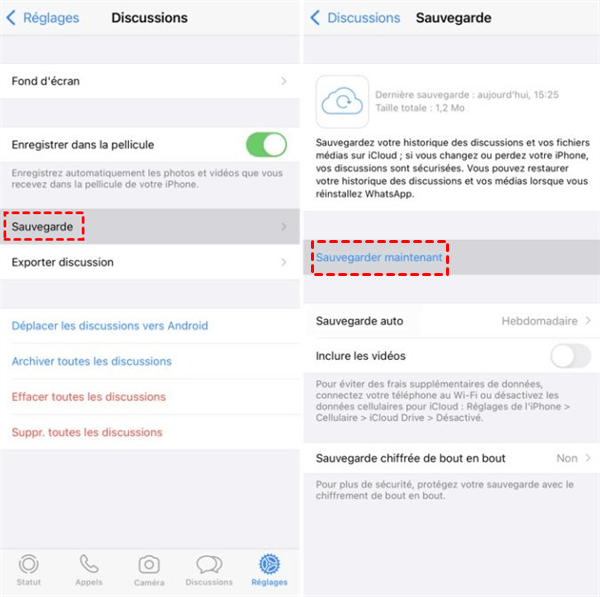 Étape 1. Sauvegardez votre WhatsApp Business en visitant ses Réglages > Sauvegarde > Enfin, cliquez sur l'option Sauvegarder maintenant.