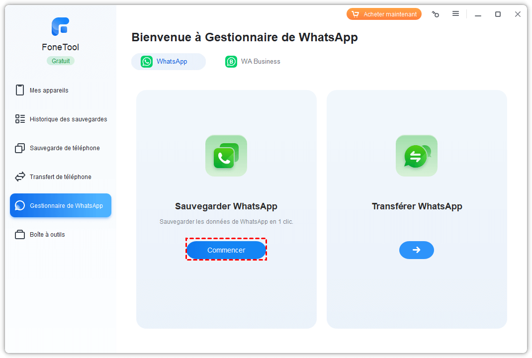 Étape 2. Dans l'interface principale de FoneTool, cliquez sur Gestionnaire de WhatsApp dans le panneau de gauche > WhatsApp > Transférer WhatsApp > Commencer.