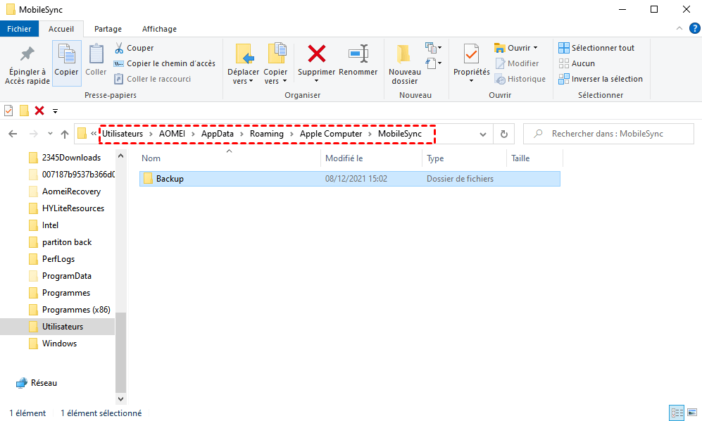 Comme iCloud, vous ne pouvez trouver que les emplacements de sauvegarde d'iTunes, mais les fichiers de sauvegarde sont cryptés et ne peuvent pas être consultés. Par défaut, votre sauvegarde iTunes est stockée dans C:/Utilisateurs/[nom du PC]/AppData/Roaming/Apple Computer/MobileSync/Backup.