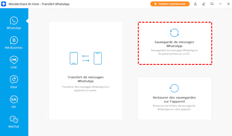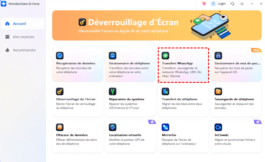 Étape 1. Connectez votre iPhone à l'ordinateur > Téléchargez, installez et lancez Dr.Fone sur votre ordinateur et choisissez la fonction Transfert WhatsApp sur l'écran d'accueil.