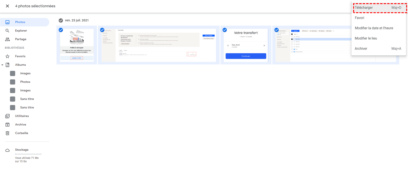 Ouvrez un navigateur et rendez-vous sur le site Web de Google Photos > Connectez-vous à votre compte > Recherchez et sélectionnez les photos dont vous avez besoin > Cliquez sur le bouton Télécharger pour les enregistrer sur votre ordinateur.