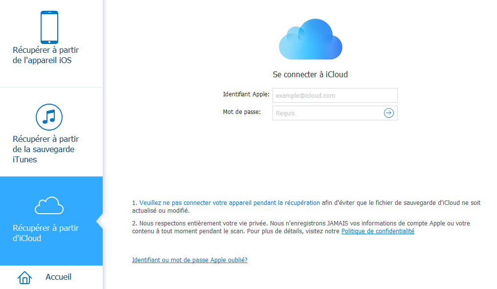 Étape 1. Télécharger et installer FoneLab sur l'ordinateur. Sélectionnez Récupérer à partir d'iCloud sur la gauche. Connectez-vous à votre identifiant Apple.