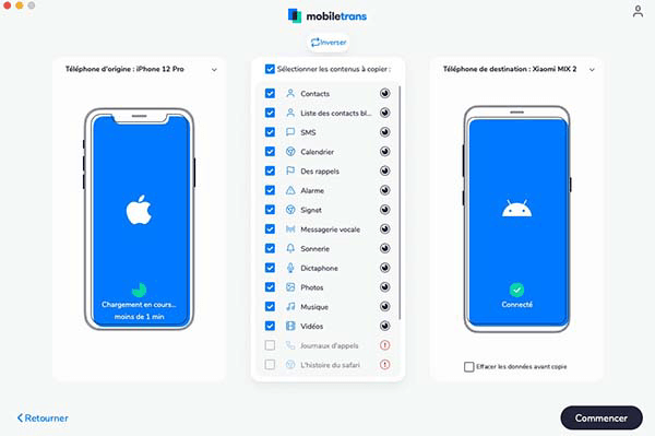 Étape 4. Assurez-vous que le sens du transfert est correct. Le téléphone Source à gauche doit être votre appareil Android et la Destination doit être votre iPhone à droite. Utilisez le bouton Échanger pour obtenir la bonne direction.
