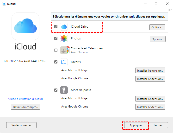 Sur PC Windows : Lancez l'application bureau iCloud pour Windows > Paramètres iCloud > Cochez iCloud Drive et appuyez sur le bouton Appliquer.