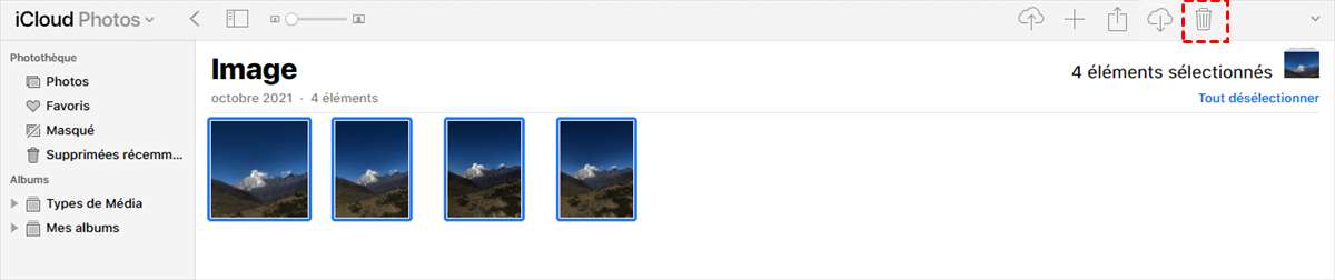 • Utilisez le raccourci clavier Ctrl + Alt pour sélectionner les photos que vous souhaitez supprimer de l'iCloud > Cliquez sur l'icône Corbeille en haut à droite pour supprimer les photos de l'iCloud.