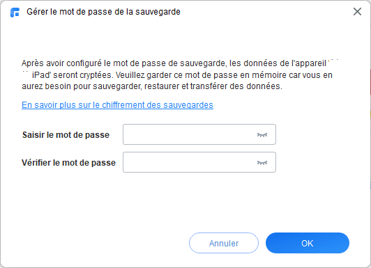 Q : Pourquoi est-il nécessaire d'entrer un mot de passe de sauvegarde lorsque je n'ai pas préalablement défini de mot de passe de sauvegarde via FoneTool ?