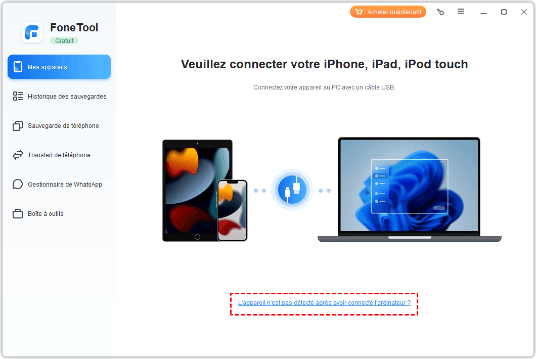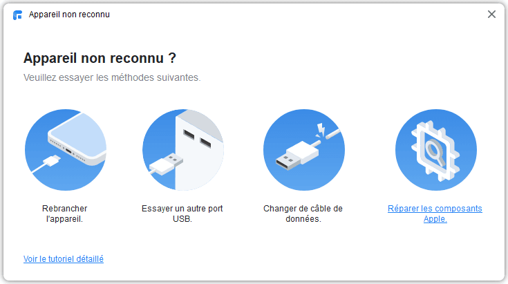Vous constaterez peut-être que votre iPhone, iPad ou iPod Touch ne peut pas être reconnu par l'ordinateur ou FoneTool même après plusieurs connexions. Pourquoi et que faire ?