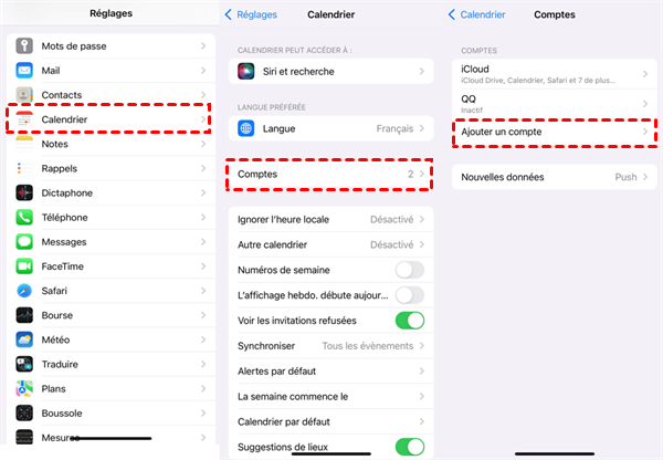 Note : Les comptes supplémentaires ne peuvent être utilisés que pour synchroniser le courrier, les contacts, le calendrier, les notes et les rappels. Nous prendrons ici l'exemple du calendrier. Mais si vous souhaitez transférer toutes les données, vous pouvez passer directement à la section suivante.