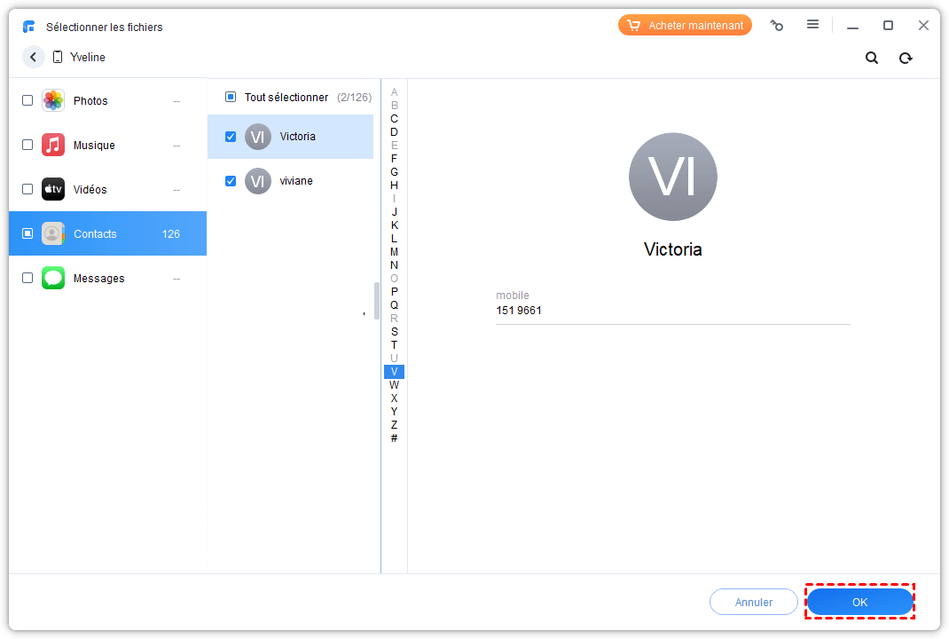 Étape 4. Prévisualisez et sélectionnez les contacts que vous souhaitez sauvegarder > Cliquez sur OK pour confirmer.