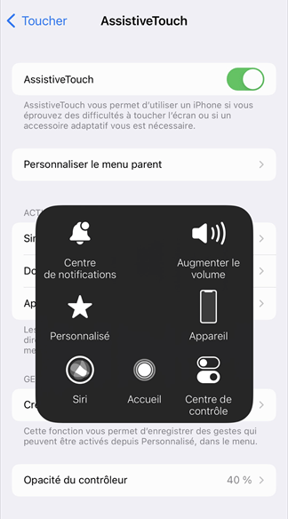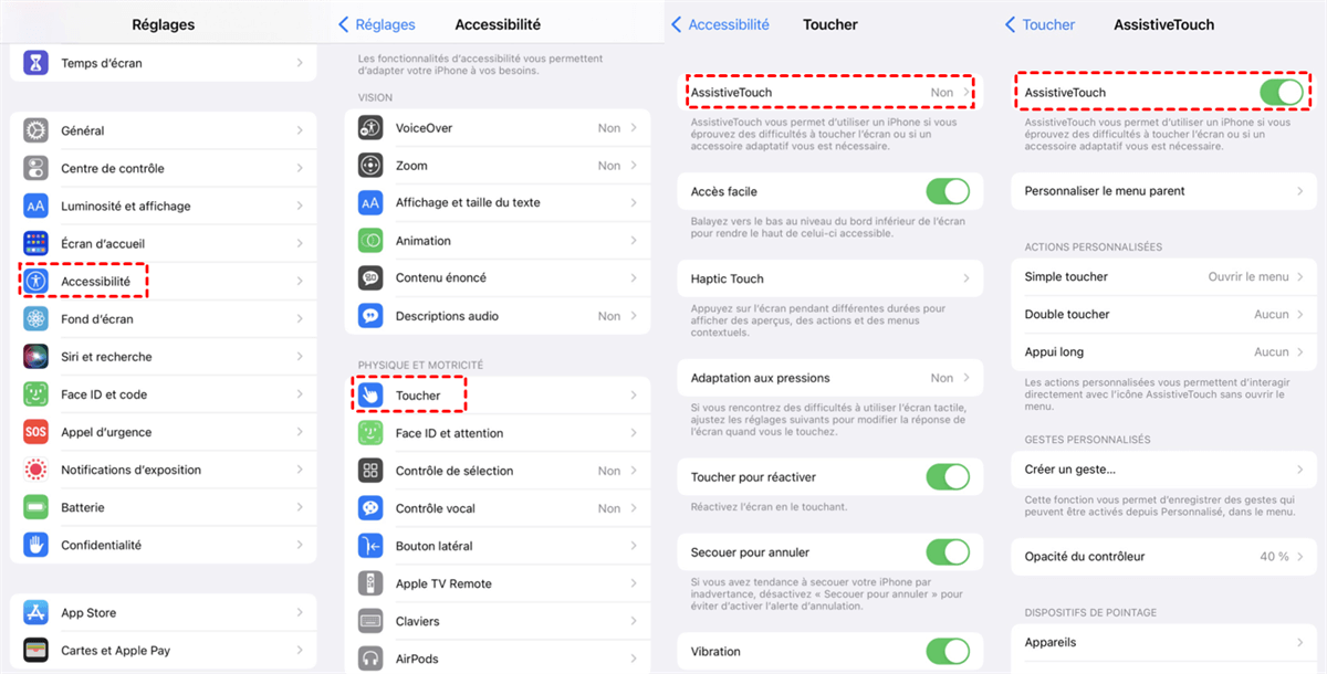 ▶ Allez dans Réglages > Accessibilité > Toucher, puis sélectionnez AssistiveTouch pour l'activer.