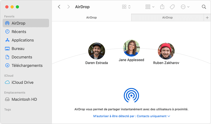 ● Sur Mac : Choisissez Aller > AirDrop dans la barre de menu du Finder, trouvez le paramètre « M'autoriser à détecter par » en bas de la fenêtre AirDrop, choisissez Contacts uniquement ou Tout le monde selon vos besoins.