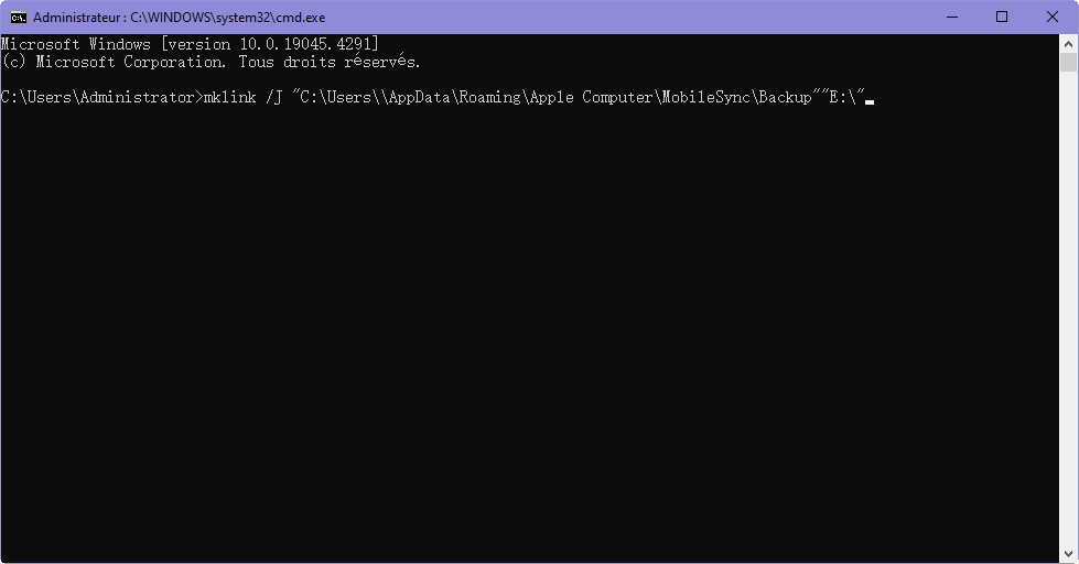 mklink /J "C:\Users\\AppData\Roaming\Apple Computer\MobileSync\Backup""E:\"