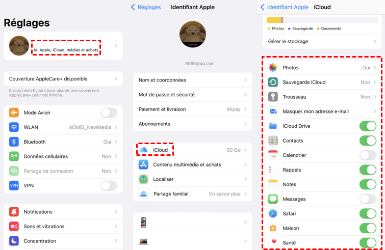 Vous pouvez activer l'option de synchronisation des photos, de la messagerie, des contacts, des calendriers, des rappels, des notes, etc. entre deux iPhones.