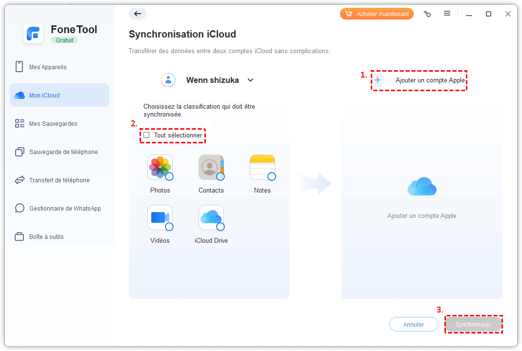La fonction de Synchronisation iCloud de FoneTool vous permet de transférer certains types de données iCloud vers un nouveau compte iCloud en un clic. Suivez les étapes ci-dessous pour savoir comment transférer des données iCloud vers un autre compte iCloud.