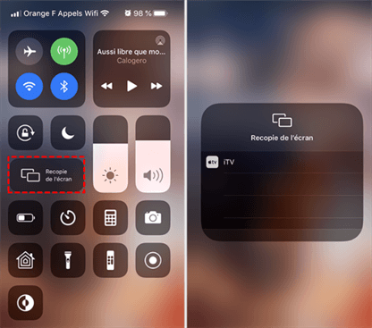 Étape 2. Ouvrez le Centre de contrôle (faites-le descendre depuis le coin supérieur droit ou de bas en haut, selon le modèle de votre appareil) > Pressez Recopie de l'écran > Choisissez l'appareil compatible AirPlay disponible.