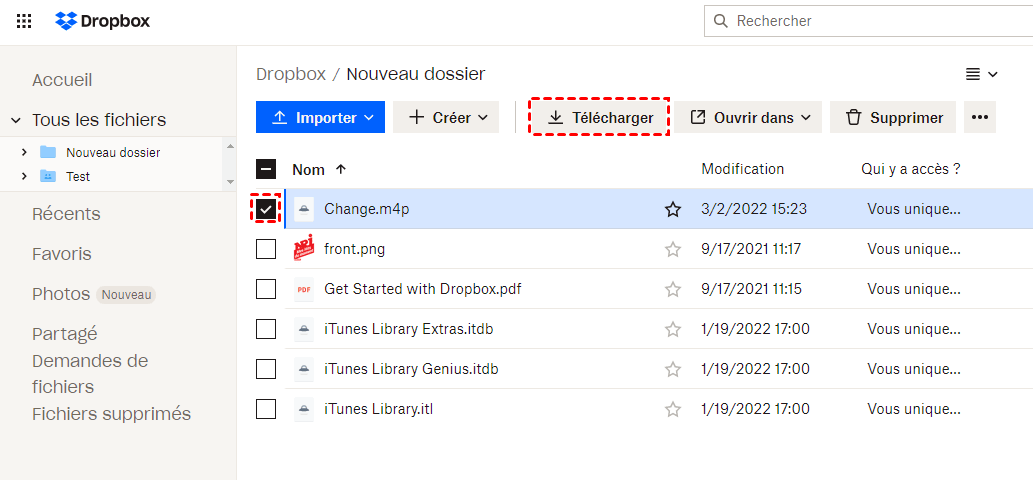 Sur votre ordinateur : Ouvrez un navigateur et accédez à Dropbox > Connectez-vous avec votre compte > Trouvez les chansons que vous avez importées sur votre Dropbox et téléchargez-les sur votre ordinateur.