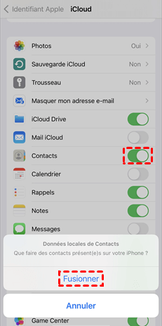 Étape 2. Déconnectez votre identifiant Apple > Connectez un autre identifiant Apple et activez la synchronisation des contacts > Choisissez Fusionner et les contacts stockés sur l'appareil seront synchronisés avec le nouveau compte.