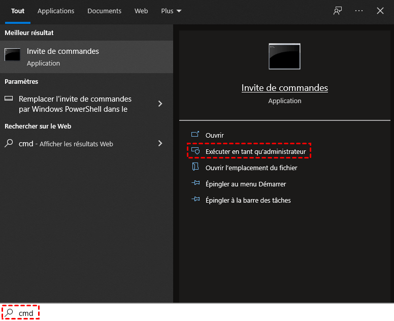 ✏️ Note : S'il vous demande des droits d'administration, à l'étape 2, vous devez taper cmd dans la barre de recherche, faire un clic droit et sélectionner Exécuter en tant qu'administrateur.
