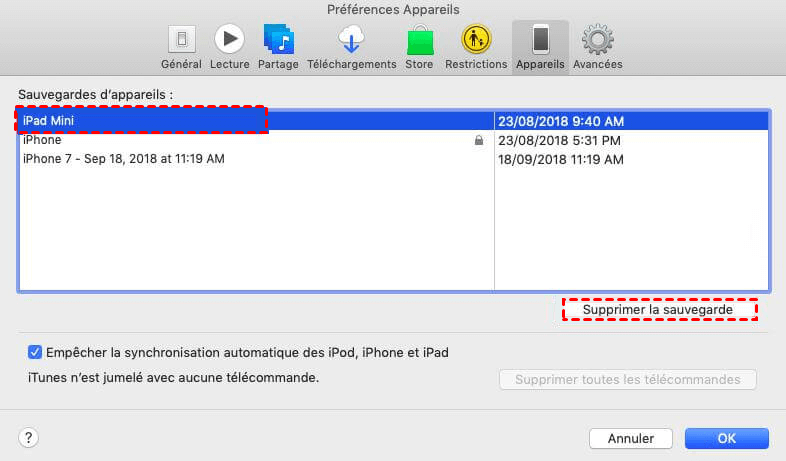 Méthode 2. Ouvrez iTunes > cliquez sur Modifier en haut > Sélectionnez Préférence > Sélectionnez Appareil. Vos sauvegardes s'affichent avec le nom de l'appareil et la date de sauvegarde. Vous pouvez supprimer le fichier sans crainte.