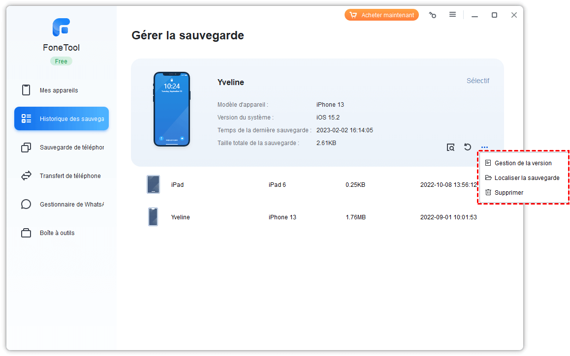 Étape 2. Sous l'onglet Appareils, vous pouvez voir les différents fichiers de sauvegarde et les heures de sauvegarde.