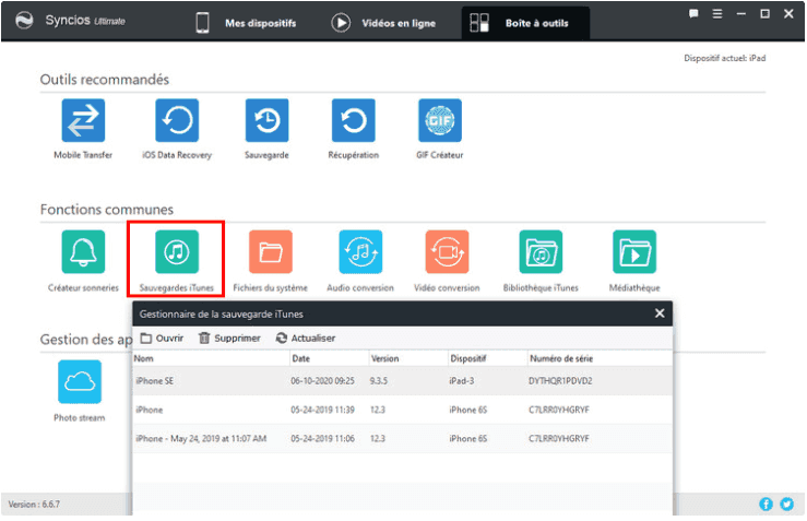 Étape 2. Cliquez sur Boîte à outils en haut de la fenêtre, puis sélectionnez Sauvegardes iTunes. Syncios trouvera automatiquement vos sauvegardes iTunes. Ensuite, vous devez choisir celle à analyser et cliquer sur Ouvrir.