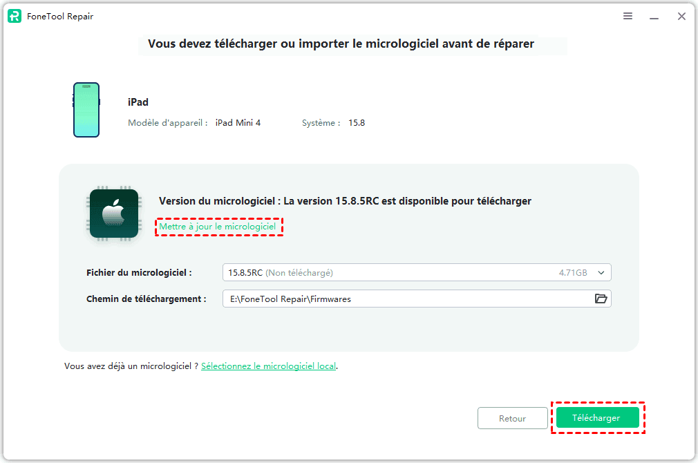 Étape 3. FoneTool téléchargera le fichier du firmware précédent sur votre iPhone. Vous pouvez ensuite cliquer sur Démarrer la réparation pour commencer à résoudre le problème de blocage de l'iPhone.