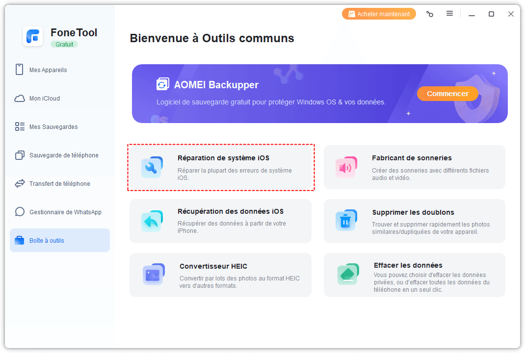 Téléchargez gratuitement FoneTool Repair sur votre ordinateur et suivez le guide pour réparer l'iPhone bloqué pendant la mise à jour logicielle.