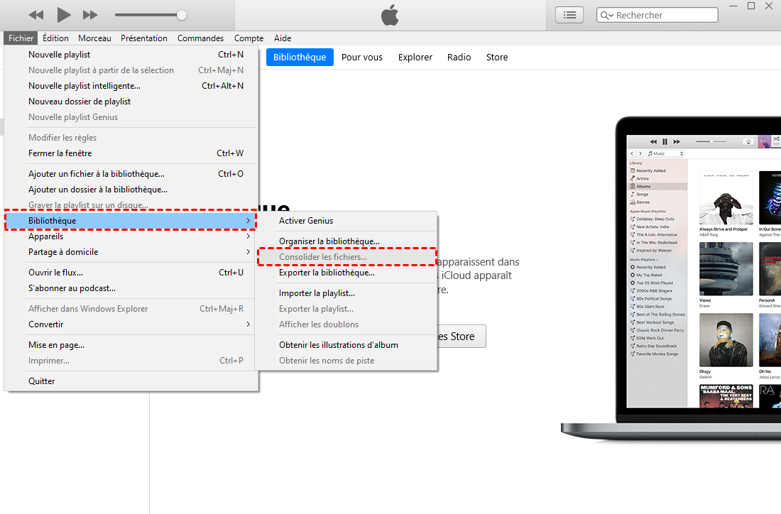 Cela peut rassembler tous les contenus d'iTunes dans un seul dossier. Vous pouvez aller sur Édition > Préférences > Avancé pour voir l'emplacement. Ne vous inquiétez pas que les fichiers d'origine soient supprimés, car iTunes ne copie que les fichiers vers la destination. Pour économiser de l'espace sur votre PC, vous devrez peut-être supprimer certains fichiers après la synchronisation. Vous pouvez également sauvegarder votre bibliothèque iTunes après la consolidation des fichiers multimédias.
