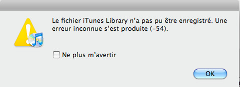 J'utilisais iTunes pour synchroniser des albums de chansons sur mon iPhone jusqu'à ce qu'il me dise que l'iPhone ne peut pas être synchronisé et qu'une erreur inconnue est survenue (-54). Je ne sais pas ce qui se passe. Quelqu'un pourrait me dire comment je peux le réparer ?