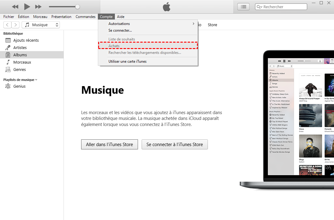 Si tous les contenus que vous souhaitez synchroniser sont des contenus achetés sur iTunes, vous pouvez les télécharger à nouveau pour résoudre l'erreur de synchronisation 54. Assurez-vous d'avoir connecté votre Apple ID et suivez les étapes suivantes :