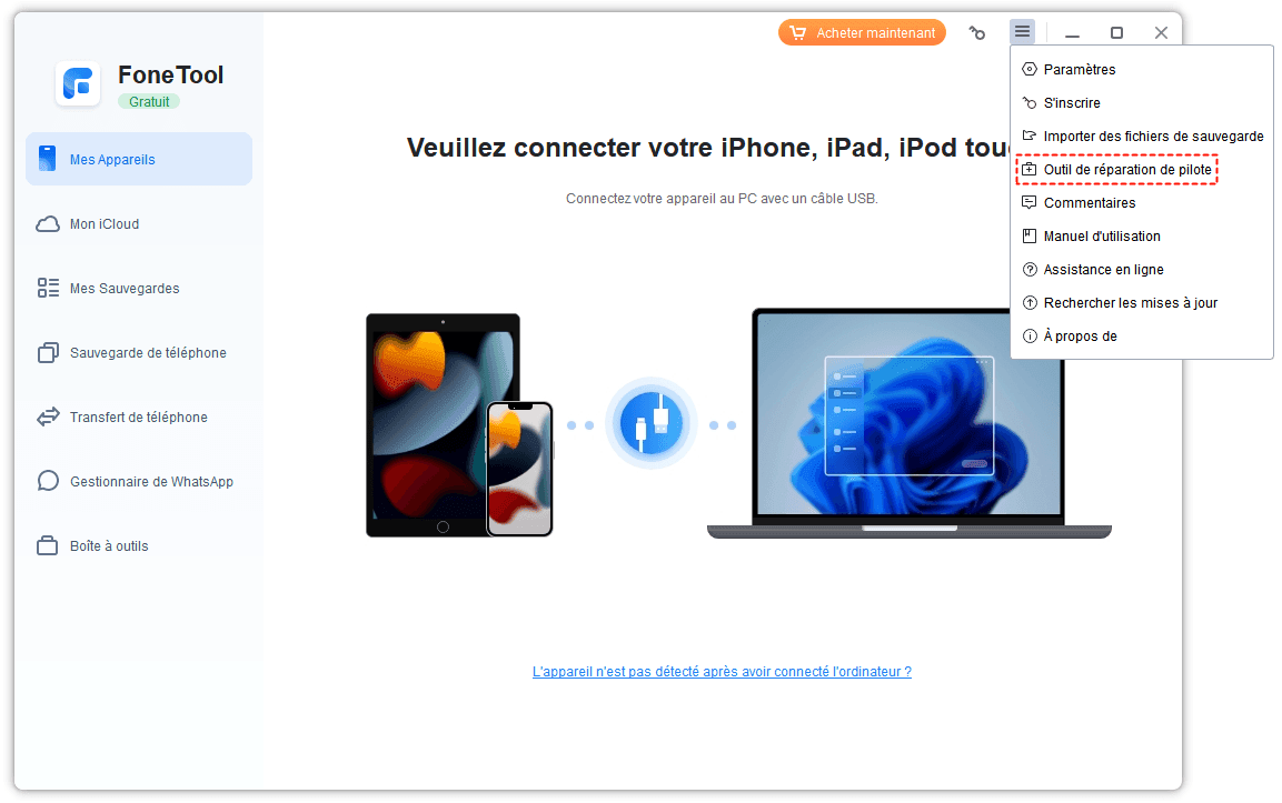 Si les conseils ci-dessus ne permettent pas de résoudre le problème : Mon iPhone ne se connecte pas à mon ordinateur via câble USB, alors l'erreur peut être causée par des raisons plus complexes. Si vous souhaitez le résoudre rapidement, vous pouvez le réparer à l'aide d'outils tiers. Nous recommandons FoneTool pour réparer le pilote et permettre à l'iPhone de se connecter au PC en toute simplicité.