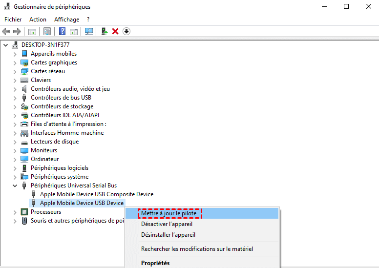 Veuillez brancher votre iPhone sur votre PC > ouvrez le Gestionnaire de périphériques > ouvrez Périphériques Universal Serial Bus> cliquez avec le bouton droit de la souris sur le bouton Apple Mobile Device USB Device > cliquez sur le bouton Mettre à jour le pilote.