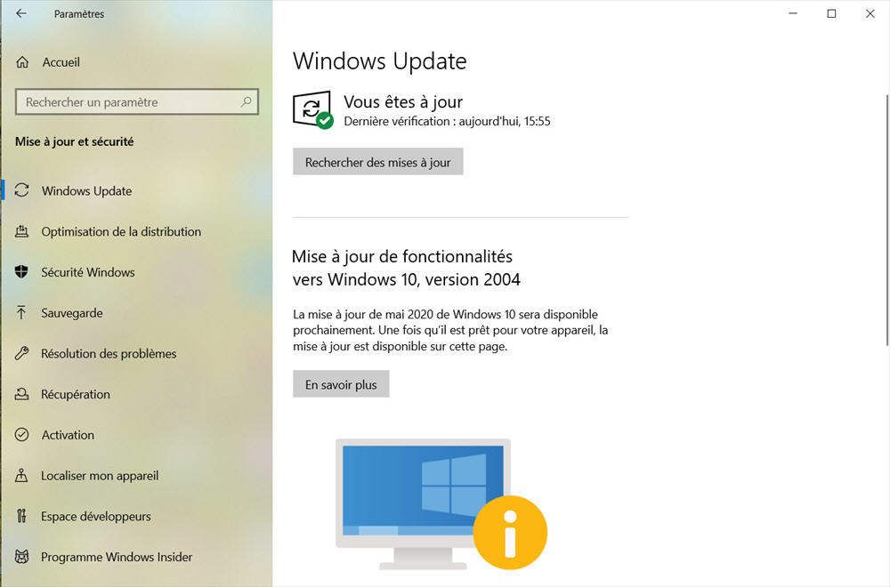 Veuillez sélectionner Démarrer > Paramètres > Mise à jour et sécurité de Windows.