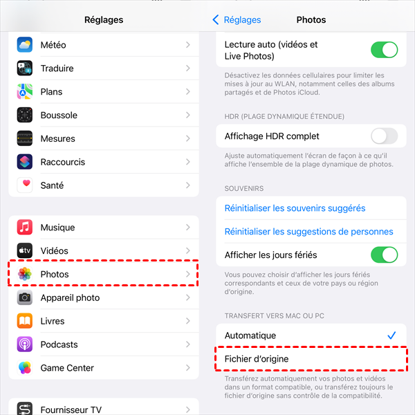 Allez dans Réglages de l'iPhone > Photos > recherchez TRANSFERT VERS MAC OU PC en bas > sélectionnez Fichier d'origine.