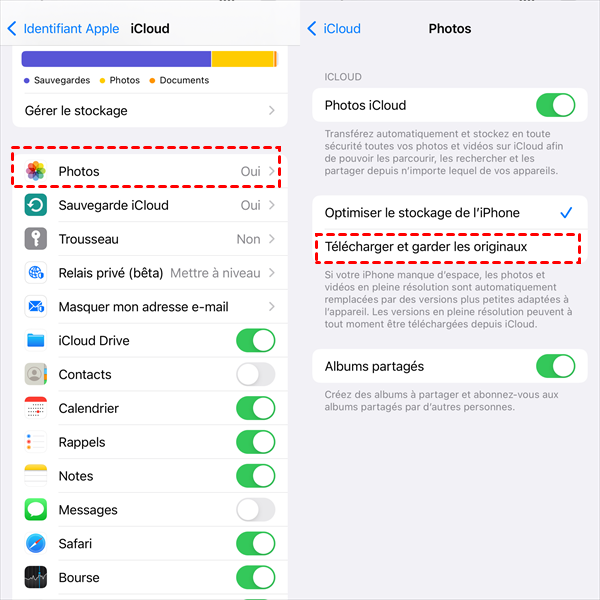 Allez dans Réglages de l'iPhone > [votre nom] > iCloud > Photos > sélectionnez Télécharger et garder les originaux.