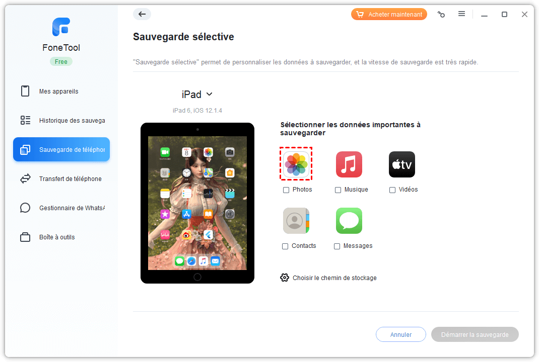 Étape 3. Cliquez sur Choisir le chemin de stockage pour choisir un emplacement pour enregistrer les fichiers sélectionnés. Cliquez ensuite sur Démarrer la sauvegarde pour exporter rapidement toutes les photos.